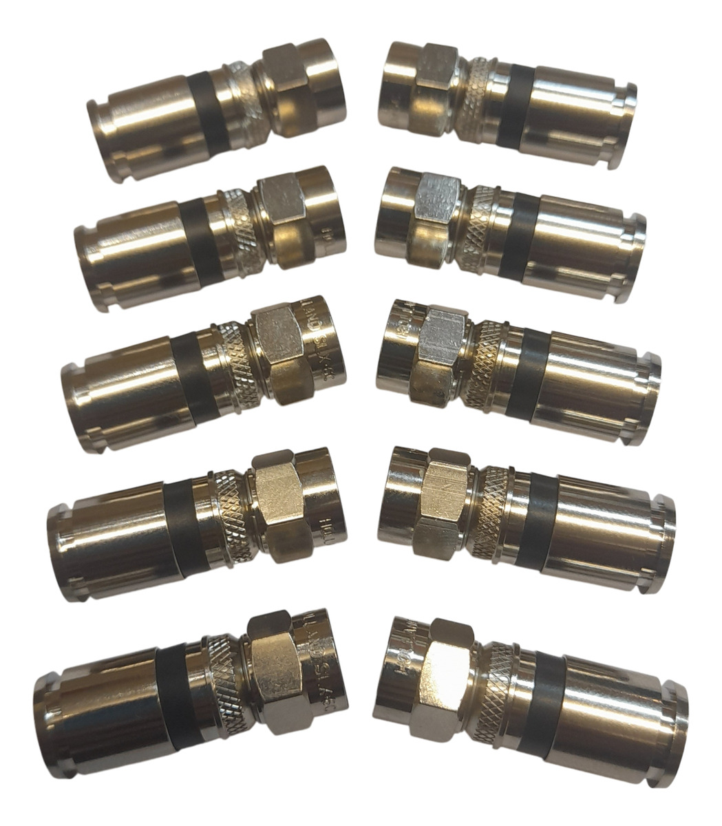 Conector F macho de compresión Holland para cable coaxil RG-6, fabricado en bronce cuenta con una compresión de 360 grados.