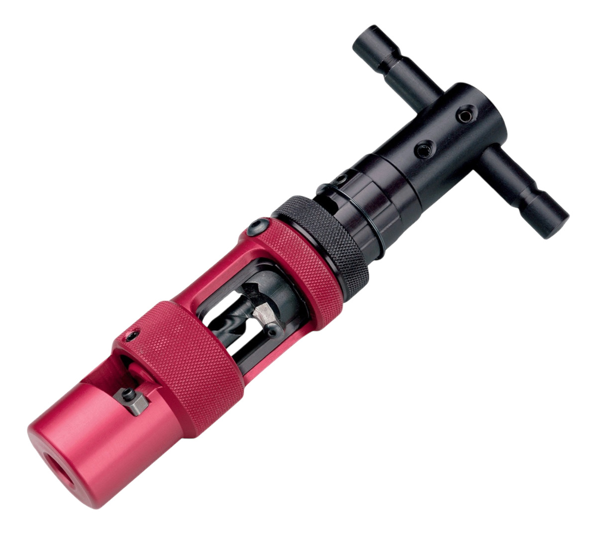 HERRAMIENTA TODO-EN-UNO, remueve con gran precisión la chaqueta y el dieléctrico, remueve y achaflana la cubierta de aluminio, su diseño permite ensamblar fácilmente la boquilla de remoción de chaquetas (QJST) gracias a su práctico ensamble giratorio de cambio rápido, puede utilizar la QCST para preparar cables resistentes a inmersión en agua siguiendo dos pasos: 1) Desarme QCST y utilice la BOQUILLA DE REMOCIóN DE CHAQUETAS QJST, identificada por código de color, para remover el recubrimiento resistente a la inmersión en agua, 2) utilice la QCST para remover el dieléctrico y la cubierta de aluminio del cable, la boquilla de remoción de chaquetas de la QCST se utiliza de manera independiente en operaciones con cables resistentes a inmersión en agua, está diseñada para remover automáticamente 3.50 pulgadas (88.9mm) cuando se alcanza el fin su rotación, tanto la boquilla de remoción de chaquetas como la herramienta de remoción del dieléctrico y cubierta de aluminio de la QCST están identificadas por código de color de acuerdo a los diferentes tipos de cables, la QCST tiene instalado de fábrica un TOPE DE TERMINADO ACHAFLANADO. Un tope de 1 (25.4mm) para las herramientas 412-750 y uno de 1-1/16? (27mm) para las herramientas 840-1160, se ha ajustado de fábrica la profundidad de incisión de la cuchilla de remoción de la chaqueta para asegurar que la boquilla de la QCST no dañe la cubierta de aluminio, las herramientas QCST tienen un mango en forma de (T) con un adaptador para taladro de 3/8 pulgadas (9.5mm) integrado; las herramientas QCST-R tienen un mango en forma de (T) CON TRINQUETE y un adaptador para taladro de 3/8 pulgadas (9.5mm) por separado, la cuchilla de corte, de larga duración, está tratada térmicamente para hacer chaflanes tersos y se puede reemplazar solamente la cuchilla sin necesidad de comprar toda la broca de remoción del dieléctrico.